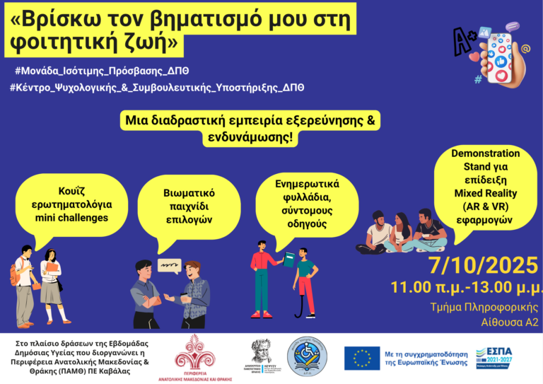 Η δράση διεξάγεται στο πλαίσιο της Εβδομάδας Δημόσιας Υγείας – Ψυχικής Υγείας & Κοινωνικής Μέριμνας της ΠΑΜΘ ΠΕ Καβάλας, με την Μονάδα Ισότιμης Πρόσβασης και το Κέντρο Ψυχολογικής & Συμβουλευτικής Υποστήριξης του Δημοκριτείου Πανεπιστημίου Θράκης.
